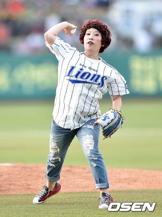 경기에 앞서 개그우먼 김영희가 시구를 하고 있다.