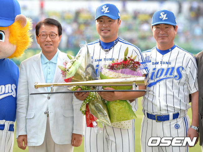 경기에 앞서 삼성 박한이가 개인통산 100홈런 시상식을 마치고 김인 삼성 라이온즈 사장, 류중일 감독, 유남호 감독관과 기념촬영을 하고 있다.