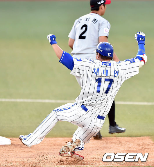 1회말 2사에서 삼성 채태인이 중전 2루타를 치고 슬라이딩을 하고 있다.