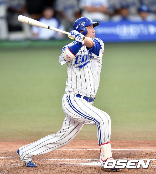 1회말 2사에서 삼성 채태인이 중전 2루타를 치고 있다.