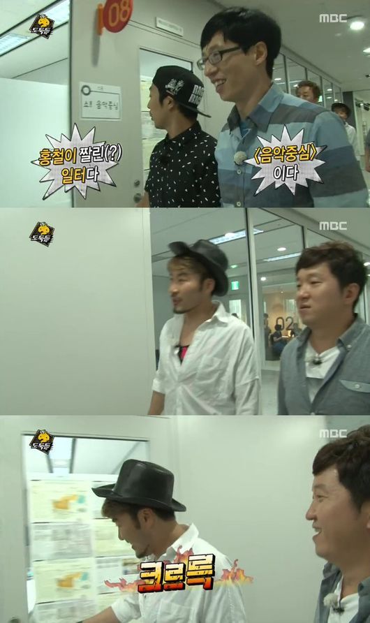 유재석은 16일 방송된 MBC 예능프로그램 ‘무한도전’에서 상암 MBC 예능본부 사무실을 돌다가 ‘쇼! 음악중심’ 회의실을 발견하고 “홍철이 잘린 일터다”라고 말했다.