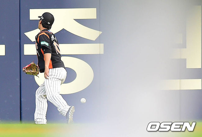2회말 두산 공격 1사 1, 2루 상황 정수빈의 플라이 타구를 롯데 좌익수 하준호가 놓치는 에러를 범하고 있다.