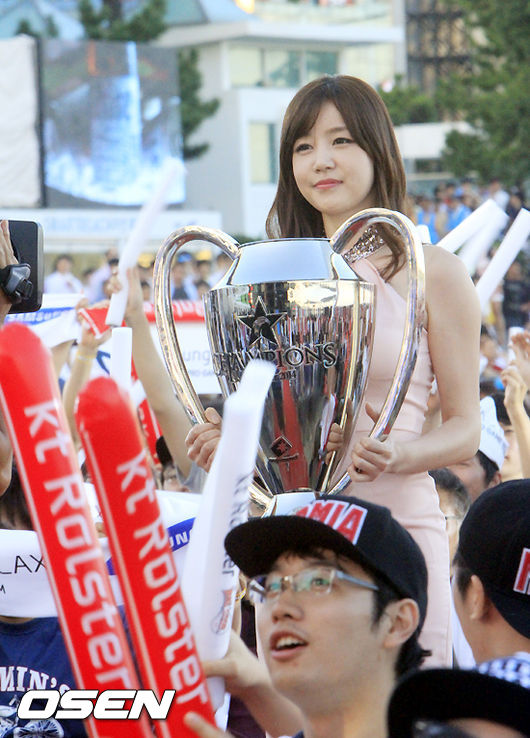 16일 오후 부산 해운대 특설무대에서 '핫식스 LOL챔피언스(이하 롤챔스)' 서머 2014 결승전이 열렸다. 인기 레이싱모델 홍지연이 이번 롤챔스 서머 시즌 우승컵을 들고 입장하고 있다.