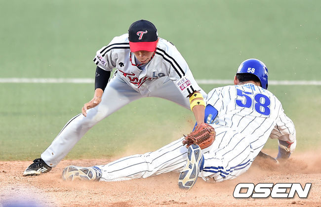 2회말 무사 1루에서 삼성 박해민이 중전 안타를 치고 중견수 실책을 틈타 2루로 쇄도해 세이프 되고 있다.