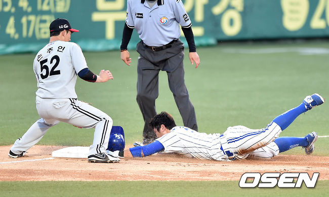 2회말 무사 1루에서 삼성 박해민이 중전 안타때 1루주자 조동창이 중견수 실책을 틈 타 3루로 쇄도해 세이프 되고 있다.