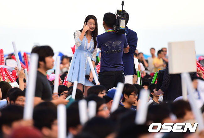 16일 오후 부산 해운대 특설무대에서 진행된 '핫식스 LOL챔피언스(이하 롤챔스)' 서머 2014 결승전'에서 달샤벳 수빈과 전용준 캐스터가 오프닝을 하고 있다.