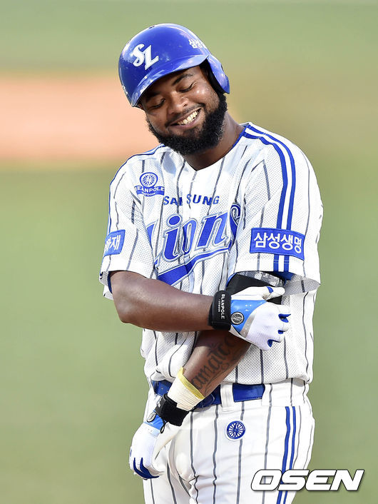 2회말 2사 2루에서 삼성 나바로가 중전 적시타를 치고 미소를 짓고 있다.