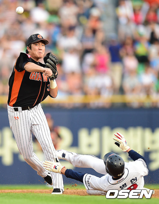 2회말 두산 공격 1사 만루 상황 김재호의 병살타 때 롯데 2루수 정훈이 주자 민병헌을 포스아웃 시킨 뒤 1루로 송구하고 있다.