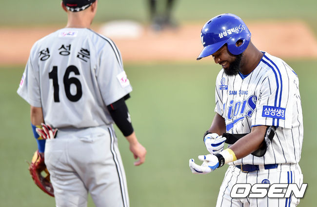 2회말 2사 2루에서 삼성 나바로가 중전 적시타를 치고 미소를 짓고 있다.