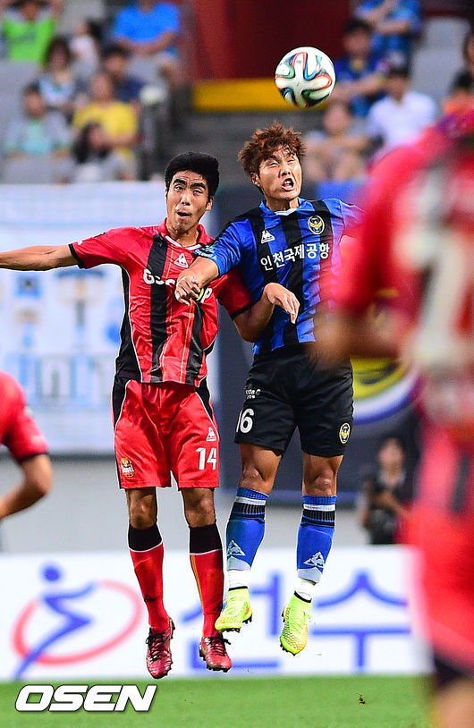 16일 서울 상암동 서울월드컵경기장에서 열린 2014 현대오일뱅크 K리그 클래식 FC 서울과 인천 유나이티드의 경기, 전반 FC서울 박희성과 인천 이윤표가 공중볼을 다투고 있다