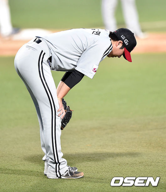 3회말 2사 만루에서 LG 우규민이 삼성 김상수에게 우중간 2타점 적시타를 허용하며 아쉬워하고 있다.
