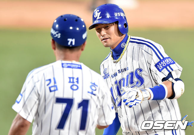 3회말 2사 만루에서 삼성 김상수가 우중간 2타점 적시타를 치고 김평호 코치와 하이파이브를 하고 있다.