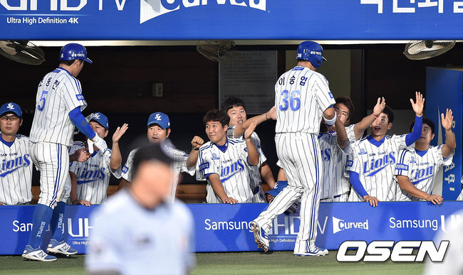 3회말 2사 만루에서 삼성 김상수의 우중간 2타점 적시타때 홈을 밟은 3루주자 이승엽과 2루주자 조동찬이 더그아웃에서 동료들과 하이파이브를 하고 있다.