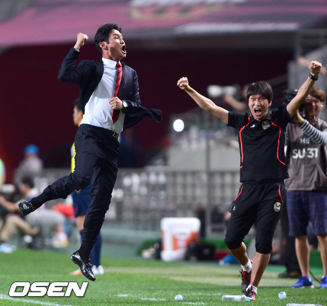 16일 서울 상암동 서울월드컵경기장에서 열린 2014 현대오일뱅크 K리그 클래식 FC 서울과 인천 유나이티드의 경기, 전반 서울 김치우의 추가골때 최용수 감독이 환호하고 있다.