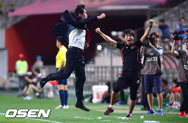 16일 서울 상암동 서울월드컵경기장에서 열린 2014 현대오일뱅크 K리그 클래식 FC 서울과 인천 유나이티드의 경기, 전반 서울 김치우의 추가골때 최용수 감독이 환호하고 있다.