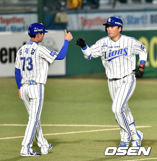 4회말 2사 1루에서 삼성 이승엽이 우중월 투런 홈런을 치고 김재걸 코치와 하이파이브를 하고 있다.