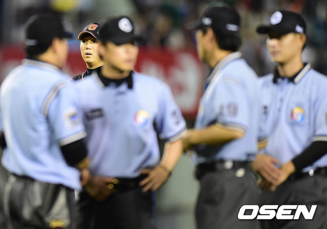 4회말 두산 공격 무사 1루 상황 민병헌의 인정 우중간 2루타를 두고 심판진이 모여 대화를 나누고 있는 가운데, 롯데 선발 장원준이 심판진의 결정을 기다리고 있다.