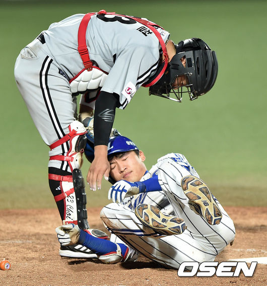 4회말 2사 1루에서 LG 신동훈의 투구를 맞은 삼성 박해민이 고통스러워하고 있다.