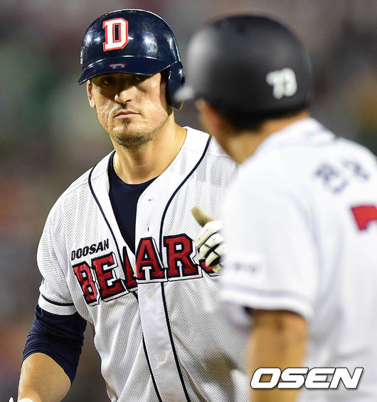 4회말 두산 공격 1사 2, 3루 상황 칸투가 1타점 우익수 희생플라이를 날리고 전상렬 코치와 인사를 나누며 더그아웃으로 들어오고 있다.