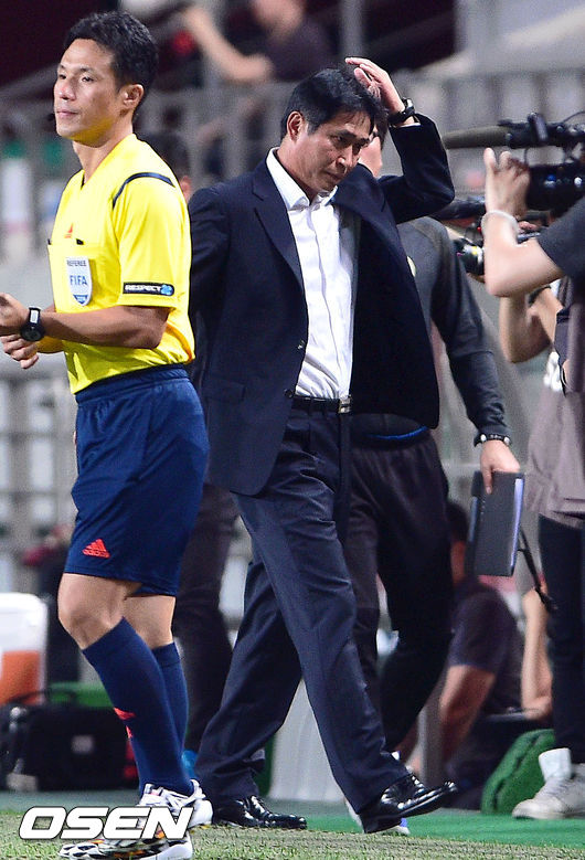 16일 서울 상암동 서울월드컵경기장에서 열린 2014 현대오일뱅크 K리그 클래식 FC 서울과 인천 유나이티드의 경기, 전반 종료 후 인천 김봉길 감독이 아쉬운 표정으로 그라운드를 빠져나가고 있다