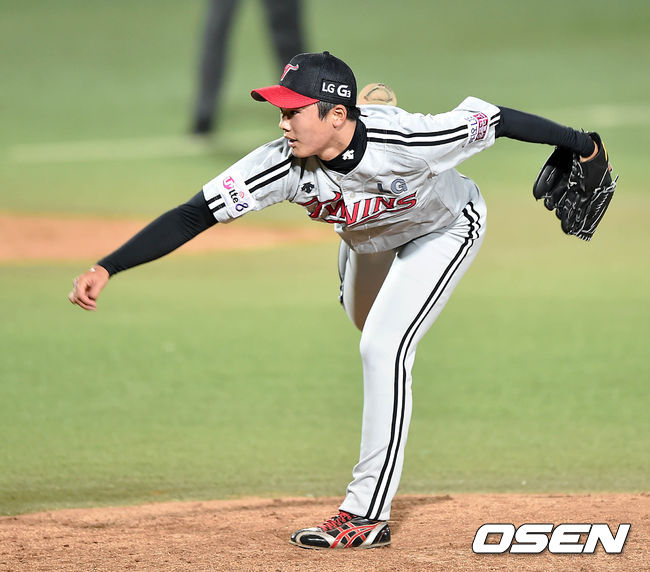 4회말 2사 1루에서 LG 신동훈이 힘차게 공을 던지고 있다.