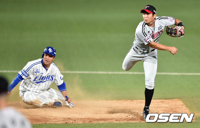 5회말 무사 1,3루에서 LG 오지환이 홈으로 쇄도하는 삼성 3루주자 박한이를 보고 빠르게 송구하고 있다.
