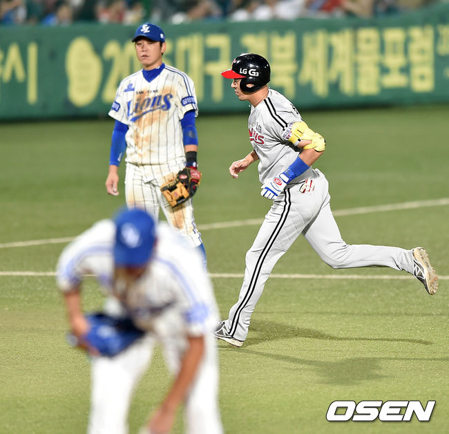 5회초 2사에서 LG 정성훈이 좌월 솔로 홈런을 치고 그라운드를 달리고 있다.