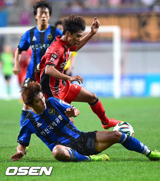 16일 서울 상암동 서울월드컵경기장에서 열린 2014 현대오일뱅크 K리그 클래식 FC 서울과 인천 유나이티드의 경기, 후반 서울 윤일록이 인천 이윤표의 태클에 걸려 넘어지고 있다.