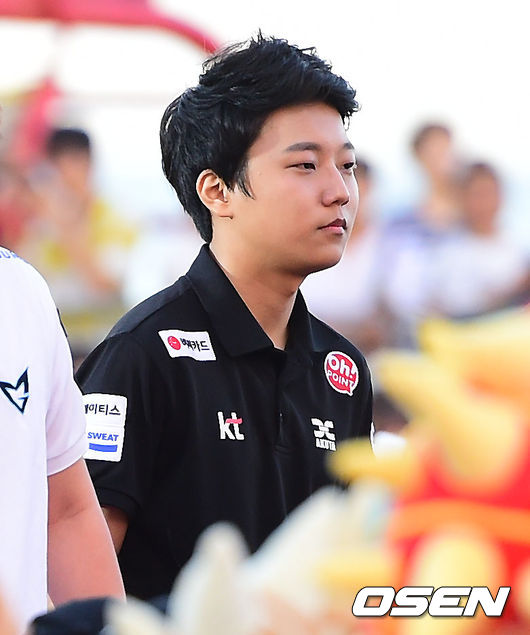 16일 오후 부산 해운대 특설무대에서 진행된 '핫식스 LOL챔피언스(이하 롤챔스)' 서머 2014 결승전'에서 KT 애로우즈 상단 '썸데이' 김찬호 마오카이가 무대로 입장하고 있다.