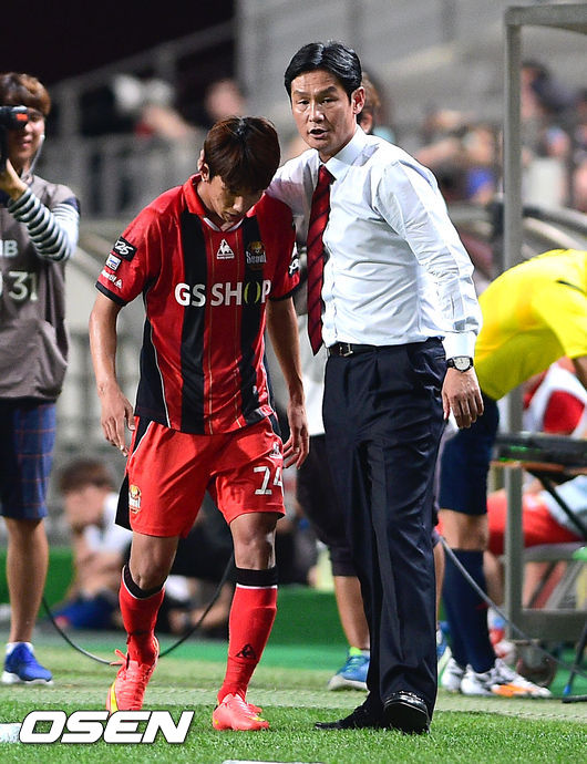 16일 서울 상암동 서울월드컵경기장에서 열린 2014 현대오일뱅크 K리그 클래식 FC 서울과 인천 유나이티드의 경기, 후반 물리나와 교체된 윤일록이 최용수 감독의 격려를 받고 있다