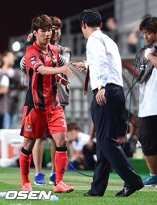 16일 서울 상암동 서울월드컵경기장에서 열린 2014 현대오일뱅크 K리그 클래식 FC 서울과 인천 유나이티드의 경기, 후반 서울 윤일록이 몰리나와 교체된 후 최용수 감독과 악수를 나누고 있다