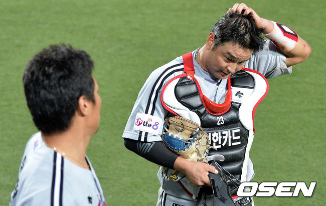 5회말 2사 2루에서 포수 최경철이 김재민과 교체되고 있다.