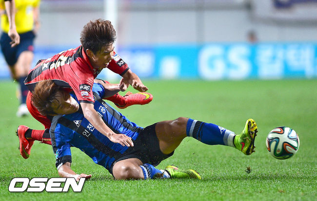 16일 서울 상암동 서울월드컵경기장에서 열린 2014 현대오일뱅크 K리그 클래식 FC 서울과 인천 유나이티드의 경기, 후반 서울 윤일록이 인천 이윤표의 태클에 걸려 넘어지고 있다