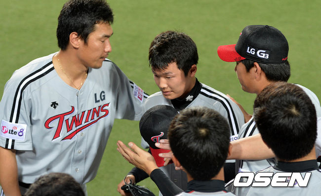 6회말 2사에서 LG 신동훈이 교체되어 들어가고 있다.