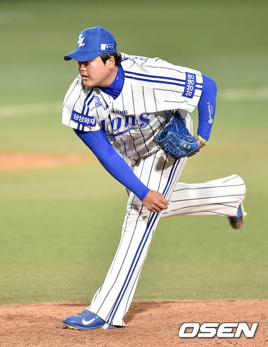 7회초 무사에서 삼성 김현우가 힘차게 공을 던지고 있다.