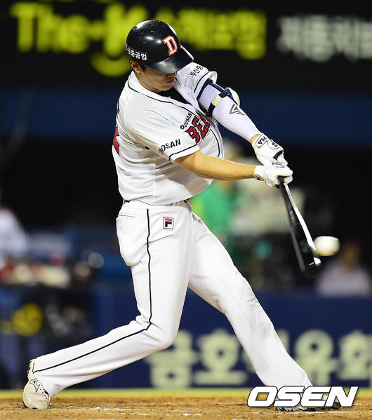 7회말 두산 공격 2사 1, 3루 상황 김재호가 적시 1타점 좌전안타를 날리고 있다.