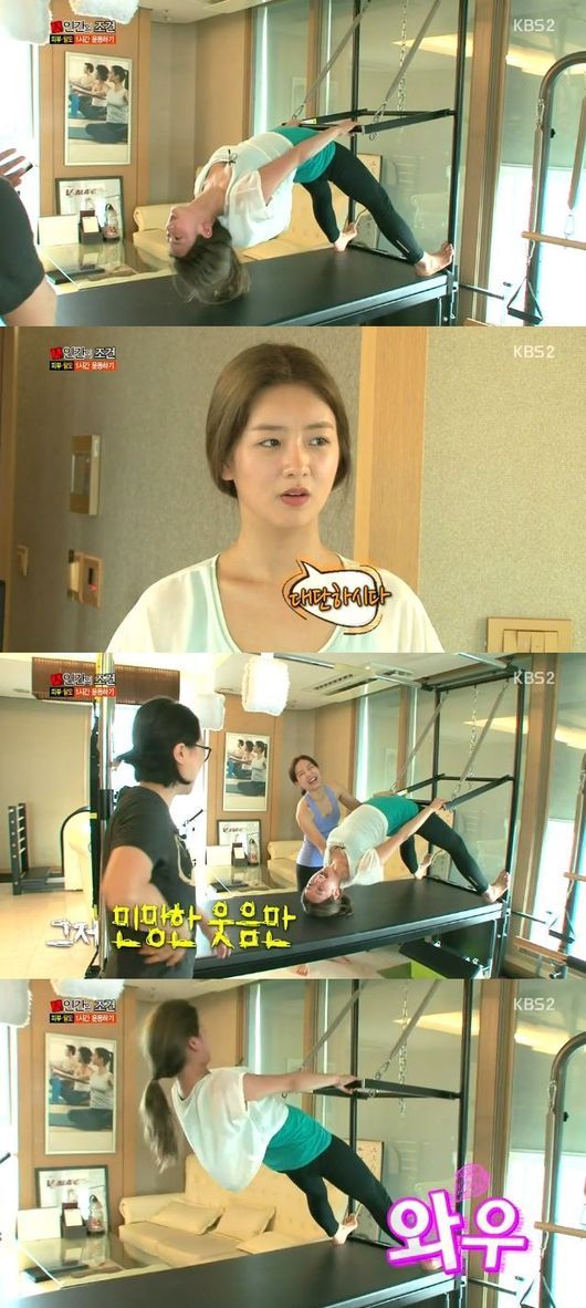 보미는 16일 오후 11시 15분 방송된 KBS 2TV '인간의 조건'에서 김숙과 함께 피부 건강을 준수하기 위해 고급 필라테스 동작에 도전하는 모습이 담겼다.