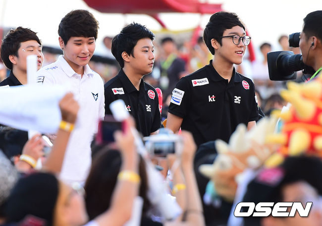 16일 오후 부산 해운대 특설무대에서 진행된 '핫식스 LOL챔피언스(이하 롤챔스)' 서머 2014 결승전'에서 삼성 블루와 KT 애로우즈 선수들이 무대로 입장하고 있다.