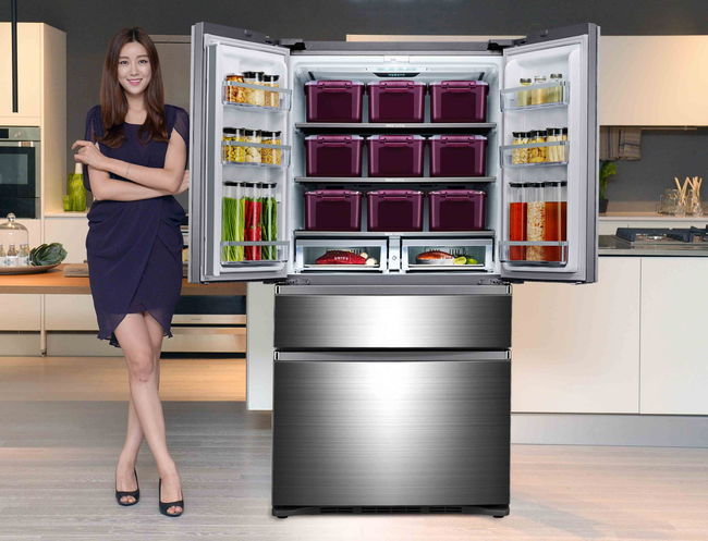 삼성전자 모델이 17일 삼성전자 수원사업장 생활가전동 프리미엄 하우스에서 땅 속 김장독을 그대로 구현한 '메탈그라운드' 기술을 적용한 '2015년형 삼성 지펠아삭 M9000'을 소개하고 있다.