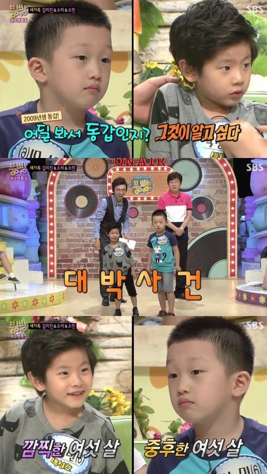 소민 군과 정빈 군은 17일 오전 방송된 SBS 예능프로그램 '스타주니어쇼 붕어빵'에서 덩치부터 얼굴 생김새까지 중후한 6살, 깜찍한 6살로 등장해 웃음을 자아냈다.