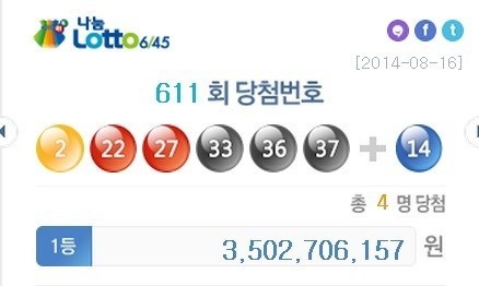 지난 16일 제611회 로또복권을 추첨한 결과 '2, 22, 27, 33, 36, 37' 등 6개가 1등 당첨번호로 뽑혔다. 2등 보너스 번호는 '14'다. 당첨번호 6개를 모두 맞힌 1등 당첨자는 4명으로 35억 270만 6157원을 받는다.