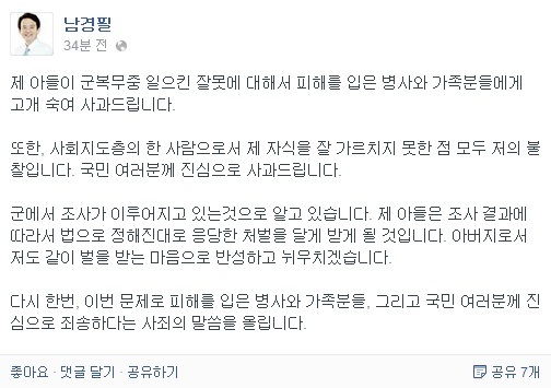 이와 관련해 남경필 지사는 이날 오후 자신의 페이스북을 통해 사과문을 게재하고 "아들이 군복무중 일으킨 잘못에 대해서 피해를 입은 병사와 가족분들에게 고개 숙여 사과드립니다"라고 밝혔다.
