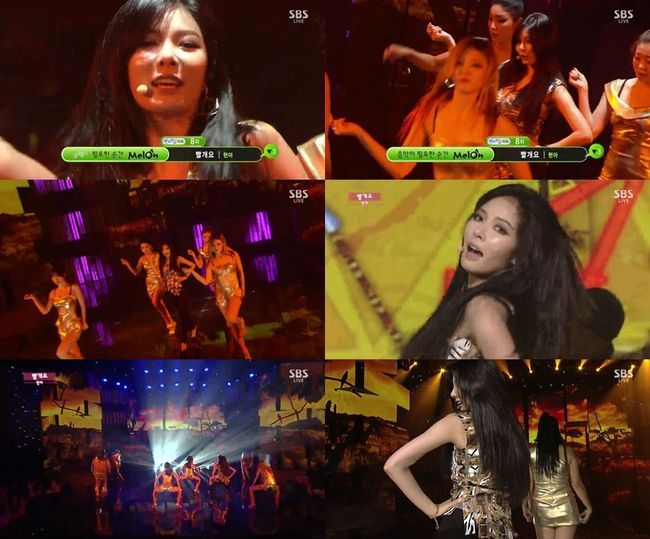 이날 현아는 금빛의 복장의 미녀 백댄서들과 함께 그 어느때보다 화끈한 무대를 펼쳤다. 긴 검은 생머리와 빨간 립스틱의 현아는 특유의 흰 피부와 어우러져 더욱더 섹시미를 극대화시켰다.