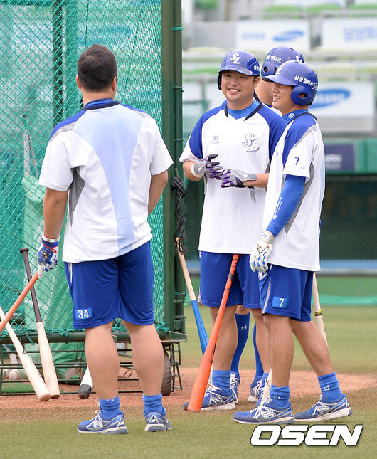 경기에 앞서 삼성 최형우, 박한이, 김상수가 타격 훈련 중 이야기를 나누고 있다.