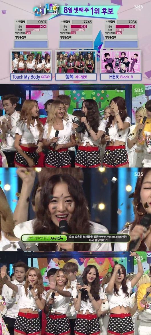 17일 오후 생방송된 SBS '인기가요'에서 '터치 마이 바디'로 레드벨벳 '행복', 블락비 '허(Her)'를 제치고 3주 연속 1위를 차지했다.