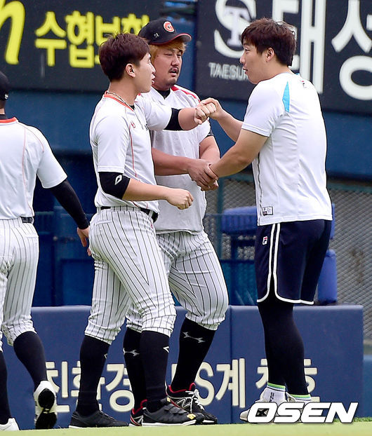 17일 오후 서울 잠실구장에서 열리는 '2014 한국야쿠르트 세븐 프로야구' 두산 베어스와 롯데 자이언츠의 경기를 앞두고, 롯데 최준석-박준서와 두산 김현수가 인사를 나누고 있다.