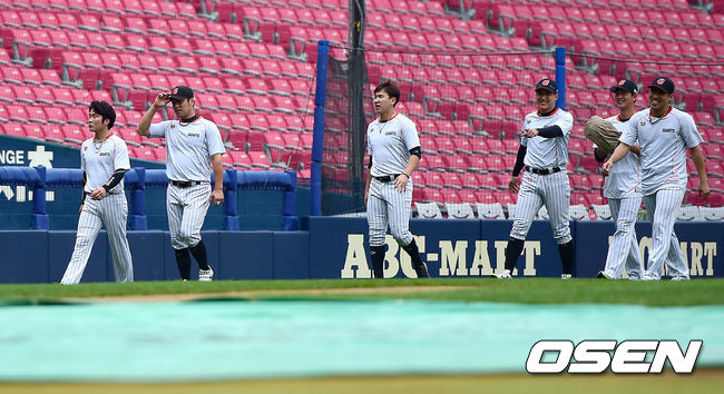 17일 오후 서울 잠실구장에서 열리는 '2014 한국야쿠르트 세븐 프로야구' 두산 베어스와 롯데 자이언츠의 경기를 앞두고, 롯데 선수들이 훈련을 마치고 그라운드를 나서고 있다.