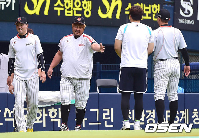 17일 오후 서울 잠실구장에서 열리는 '2014 한국야쿠르트 세븐 프로야구' 두산 베어스와 롯데 자이언츠의 경기를 앞두고, 롯데 최준석과 두산 김현수가 인사를 나누고 있다.