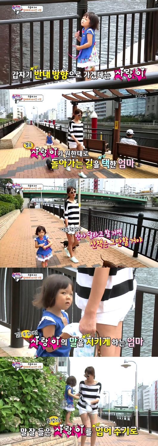 이날 방송에서 사랑이와 산책에 나선 야노 시호는 갑자기 반대 방향으로 가겠다는 사랑이에 "저쪽으로 가면 지쳐. 많이 걸어야 해"라며 타일렀다. 하지만 사랑이가 계속 우기자 할 수 없이 돌아가는 길을 택하며 "대신 안아달라고 하면 안된다"고 사랑과 약속했다.