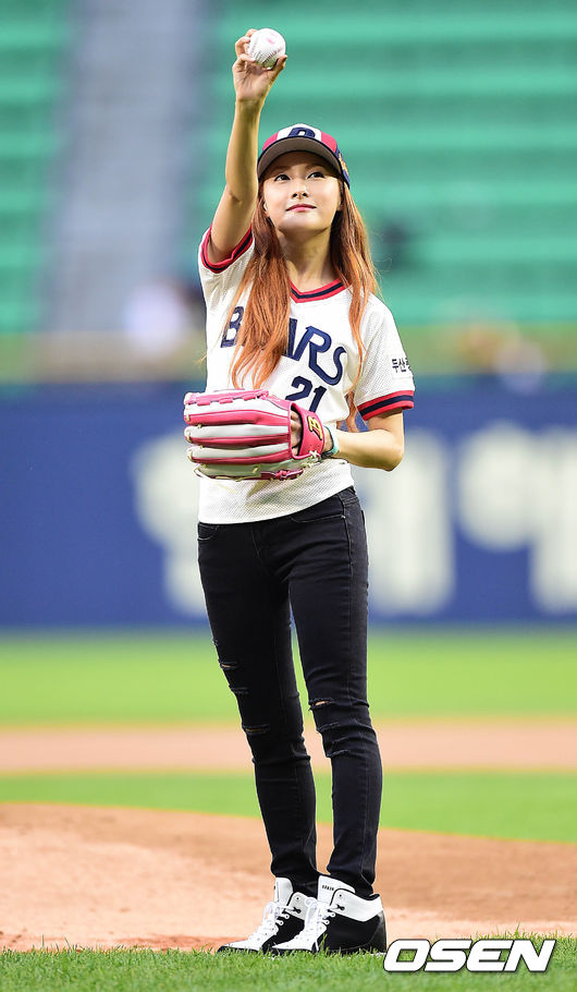 시구자로 나선 걸그룹 카라의 규리가 공을 던지기 앞서 포즈를 취하고 있다.